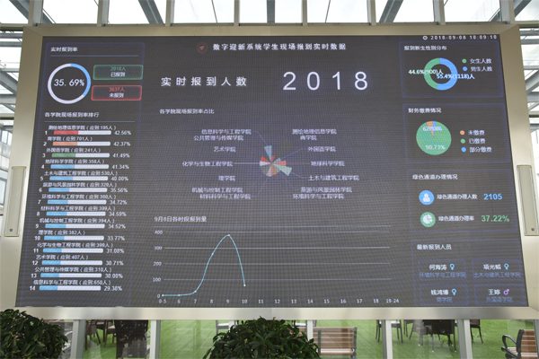 除此之外,今年的可视化、趣味化的迎新“大数据”也广受欢迎。学校在行知楼二楼大厅、一号食堂和二号食堂附近三块大屏幕上实时显示报道情况,如报到人数、各学院报到排行榜、各学院报到率占比、当日各时段报到量、报到新生性别分布、绿色通道办理情况、最新报到人员等情况。通过大屏幕我们看到,8日上午9时左右报到人数达到峰值。到9日上午9时45分,已经有超过88%的新生完成了现场报到手续。
