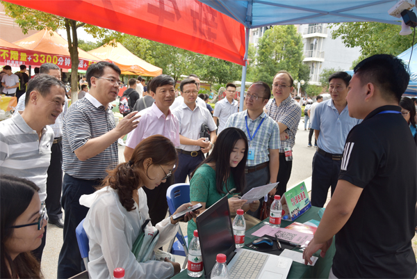 学校党委书记李国忠(左二)、校长解庆林(左三)、党委副书记王赣华(右二 )、副厅级调研员张劲松(左一)等检查指导“绿色通道”迎新工作