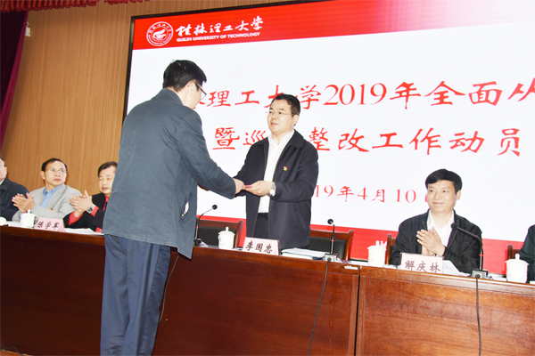 4月10日下午,学校在雁山校区图书馆报告厅召开2019年全面从严治党暨巡视整改工作动员大会。在家校领导李国忠、解庆林、王赣华、孙宁、陈学军、王玫、周国清、梁福沛、王敦球、曾繁荣、张劲松出席会议。全体中层干部,附小、社区办、校办企业主要负责人,党办、组织部、宣传部、统战部、纪委办、人事处等部门科级干部参加会议,南宁分校科级以上干部通过视频会议系统参加会议。会议由学校党委副书记、校长解庆林主持。