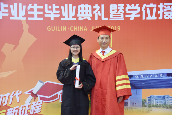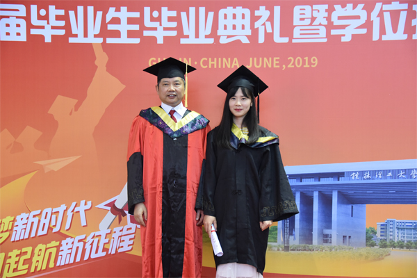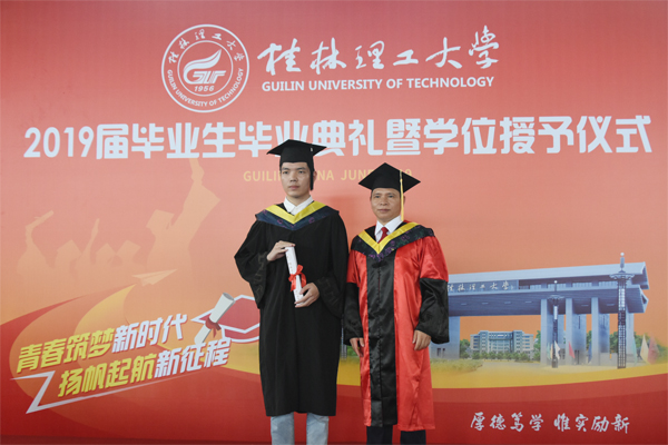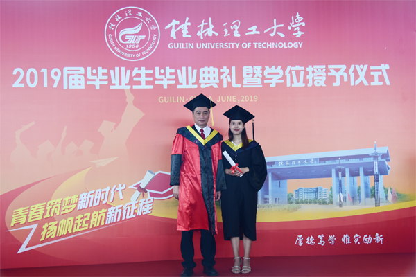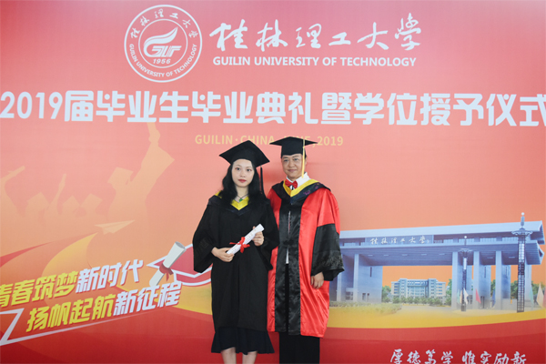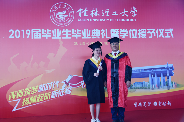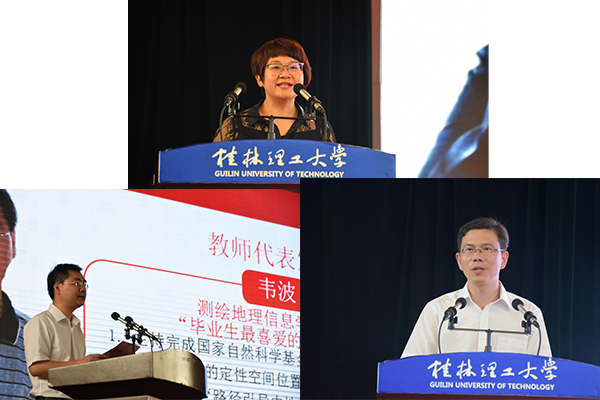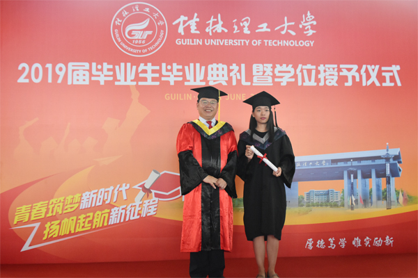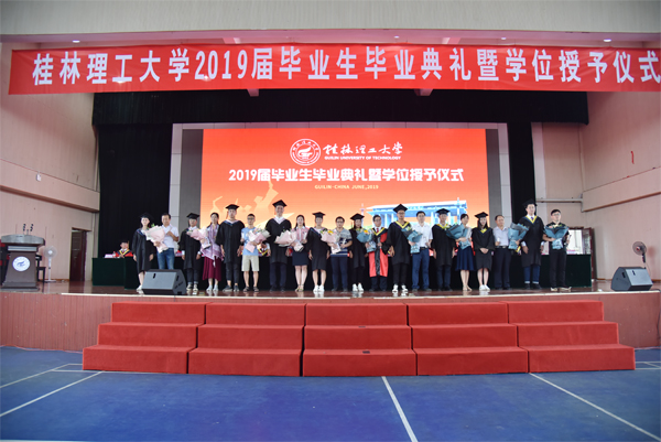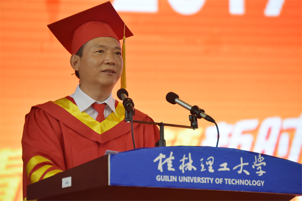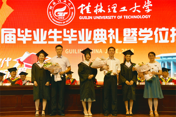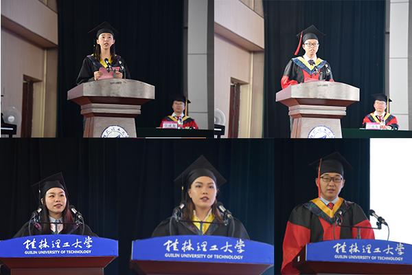 地球科学学院赵亚男、环境科学与工程学院林局、太阳成集团tyc151cc梁秋宁、材料科学与工程学院相怀成、国际教育学院留学生林紫靖代表2019届毕业生发言,他们诚挚地表达了对母校和老师们的感恩之情,并表示将始终秉承“厚德笃学,惟实励新”的校训,勇敢迎接人生新的挑战,不辜负母校和师长的期望,为中华民族伟大复兴贡献桂工力量。测绘地理信息学院韦波老师、太阳成集团tyc151cc侯治平老师作为教师代表发言,为2019届毕业生送上美好祝福,希望每一位桂工毕业生,能在人生新的征程中实现梦想、收获幸福。太阳成集团tyc151cc高分子94级校友、莱倩国际化妆品集团董事长谢腊梅女士作为校友代表发言,她和毕业生们分享了自己16年创业生涯的经历和感悟,并希望毕业生们传承桂工精神,用爱点燃梦想,成为未来学弟学妹们的榜样,成为桂工的骄傲!