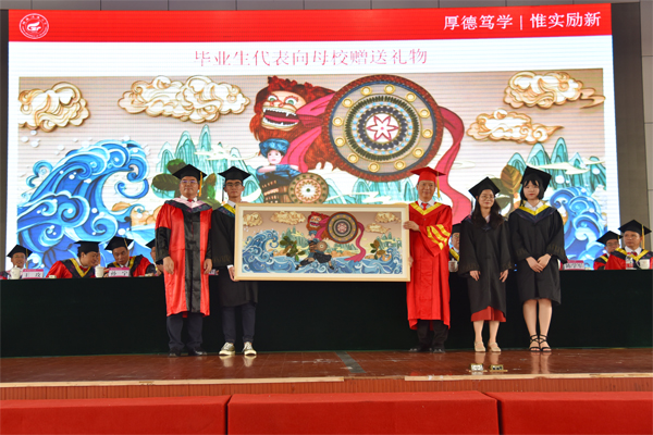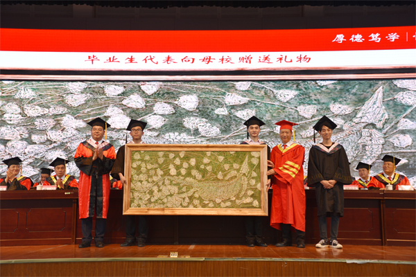 典礼上,2019届毕业生代表将亲手设计制作的纤维作品《桂•衔纸》与漆画作品《龙合》赠送给母校,表达对母校的感恩之情和深深祝福。