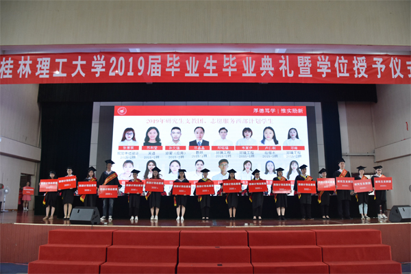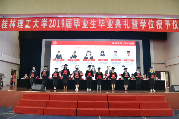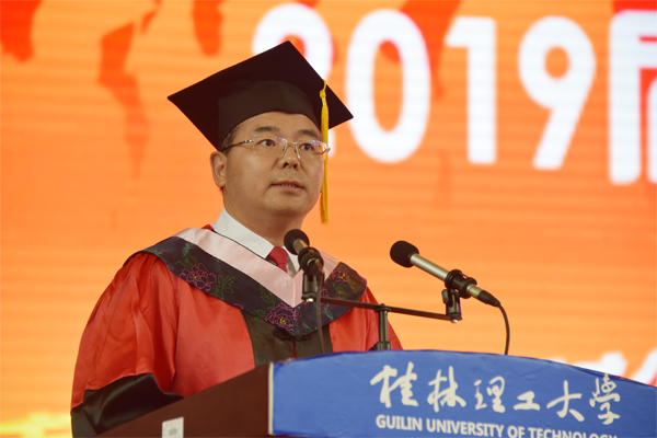 学校党委书记李国忠讲话并宣读表彰决定。李国忠书记代表学校和全体教职员工向2019届毕业生致以最衷心的祝贺和最美好的祝福,向关心、爱护、支持桂工发展的广大家长、老师和校友表示衷心的感谢和诚挚的问候。他说,我们正处在一个伟大的时代,比历史上任何一个时期更接近中华民族伟大复兴,在这个伟大的新时代,广大青年既肩负着历史重任,又拥有大有可为的广阔空间。他勉励各位毕业生,要始终牢记和认真践行习近平总书记在纪念五四运动100周年大会上讲话时对青年提出的六点要求:胸怀爱国之心、常怀报国之志;勇担时代责任、矢志艰苦奋斗;坚持终身学习,练就过硬本领;坚持修身立德,打牢道德根基,成长为德才兼备的时代新人,自觉担负起实现中华民族伟大复兴的历史重任。他希望同学们毕业后继续关心、支持母校,常回母校走走看看,母校的怀抱始终向每一位毕业生敞开,屏风山会为大家遮风避雨,雁山校园任由大家驰骋奔腾!