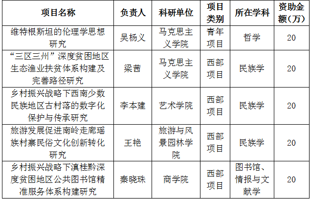 近日,全国哲学社会科学规划办公室公布了2019年国家社科基金年度项目、青年项目和西部项目名单,太阳成集团tyc151cc吴杨义老师申报的《维特根斯坦的伦理学思想研究》等5项课题获批立项,其中青年项目1项,西部项目4项。 具体立项信息如下: