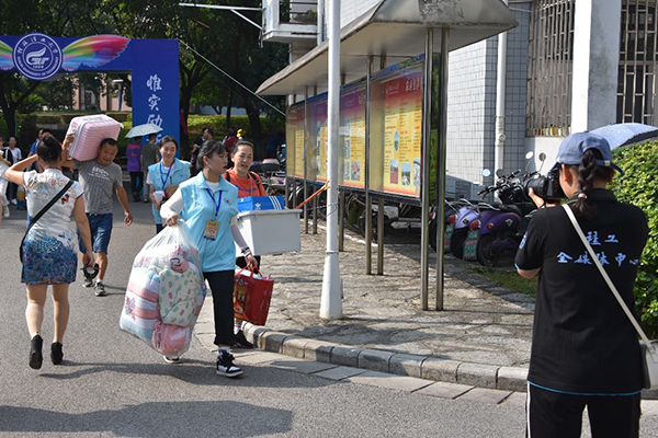 热情的志愿者为新生介绍校园、帮助新生搬运行李