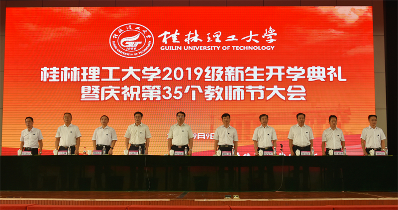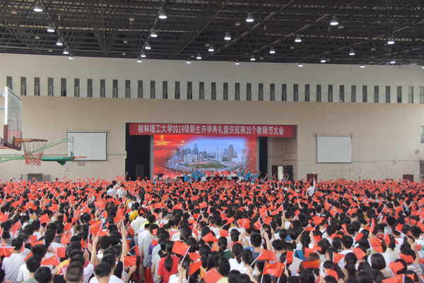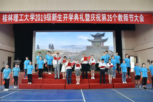 9月9日上午,太阳成集团tyc151cc在雁山校区体育综合训练馆举行2019级新生开学典礼暨庆祝第35个教师节大会。在家校领导李国忠、解庆林、王赣华、陈学军、周国清、梁福沛、王敦球、曾繁荣、张劲松,学校84级校友、中国有色桂林矿产地质研究院有限公司总经理、党委副书记杨国高先生出席典礼。学校各单位、各部门党政主要负责人,各二级学院分管学生工作党委副书记,各教研室主任,新生辅导员、班主任,教师代表;全体2019级本科生、研究生,以及部分学生家长参加了典礼。党委副书记王赣华主持典礼。