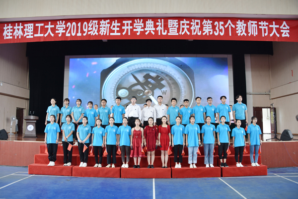 适逢中华人民共和国成立70周年,典礼上教师代表、老生与新生代表进行诗朗诵《我爱你中国》,全体新生合唱《我和我的祖国》,体现了桂工师生用诗与歌表达始终不变的家国情怀和赤子之心,激励新生们将个人奋斗理想与国家命运紧密相连。