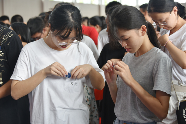 随后,在校生代表为新生代表佩戴校徽。2019级新生代表信息科学与工程学院邹云鹤同学带领全体2019级新生进行集体宣誓。