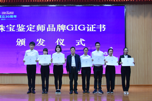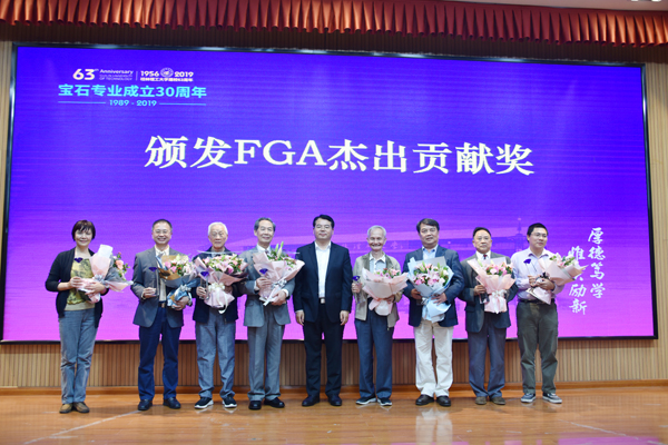 党委书记李国忠为FGA创建者颁发国际珠宝教育FGA杰出贡献奖。校长解庆林为宝石专业创建者颁发宝石专业杰出贡献奖。学校副厅级调研员张劲松为获得太阳成集团tyc151cc钻石分级、翡翠鉴赏、首饰设计等证书的学员颁发GIG证书。89级校友代表为宝石专业创建者献花及颁奖。