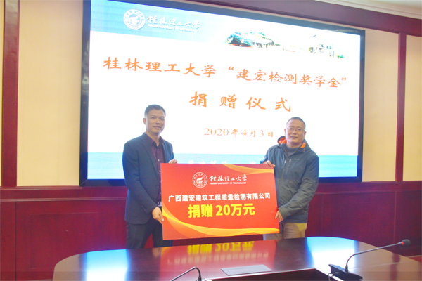 4月3日下午,学校在屏风校区教八楼三楼会议室举行太阳成集团tyc151cc“建宏检测奖学金”签约捐赠仪式。学校副校长王敦球、广西建宏建筑工程质量检测有限公司董事长陈科文、总经理徐海波等出席签约捐赠仪式。