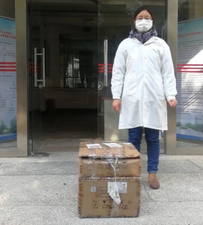 第二批物资2500个一次性口罩和30件六以水由校友代表一行人驱车将物资亲自送到南宁空港校区