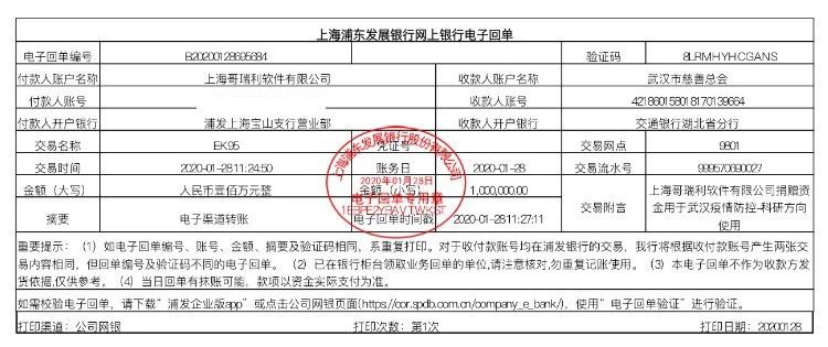 校友企业上海哥瑞利软件有限公司向武汉市慈善总会捐赠100万元