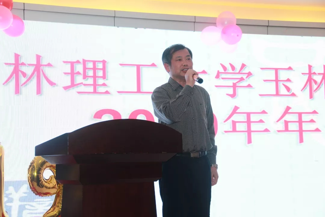 年会在校友们歌唱《我和我的祖国》歌声中拉开序幕,陈学军在年会上致辞,代表学校对玉林校友会2019年会的召开表示祝贺,对为年会筹备付出辛勤汗水的校友们表示衷心的感谢。他向与会校友介绍了近年来学校的建设发展成效,并希望玉林校友会更好的发展桥梁纽带作用,广泛联络当地校友,不断探索校友会工作的新方式,为校友、母校发展以及促进当地经济建设发展作出应有的贡献。