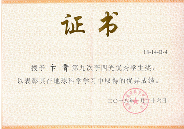 李四光优秀学生奖旨在鼓励广大地质类学生为社会主义现代化和科技进步多做贡献,推进我国地质事业的持续发展。该奖项由李四光基金会全额资助,面向正在国内接受普通高等学历教育的地质类和地质勘查类学生,每年评选一次。第九次李四光优秀学生奖共有21人获奖,其中李四光优秀博士研究生奖(2万元/人)5人,李四光优秀硕士研究生奖(1.5万元/人)5人,李四光优秀大学生奖(1万元/人)5人,李四光优秀学生提名奖6人。