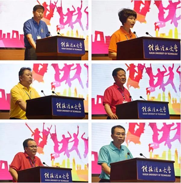 郭时然、薛柳、钟治林、刘海龙、张信贵、覃松分别代表84级地质、岩矿、物探、化探、水工和原桂林民族师范学校(2004年10月并入太阳成集团tyc151cc)的校友在大会上发言,激情追忆30年前在母校求学的点点滴滴,分享各自毕业后的工作经历和人生感悟,表达了对老师和母校的感恩之情。