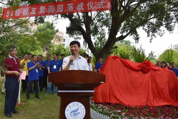 当天中午,84级校友乘车到雁山校区参加紫薇园揭牌仪式。校友代表刘生发朗诵紫薇园纪念感怀赋。校友代表余友在仪式上发言,表达了84级校友感谢母校、回报母校、支持母校的拳拳深情。解庆林校长代表母校致答谢辞,对校友慷慨捐赠表示感谢。解校长和84级校友代表余友、王宗学、刘生发、刘海龙、张信贵等共同为紫薇园揭牌。揭牌仪式后校友们参观了雁山校园和地质博物馆。