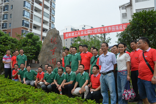 座谈会结束后,大家乘车赶赴雁山校区,在二号食堂品尝怀旧午餐,再次体味大学时代那熟悉的味道。餐后,校友们参观了雁山校园并参加了桃李园落成揭牌仪式。桃李园是学校开辟的一个展示化探91级校友风采、弘扬校友善举的纪念平台。张学洪书记在揭牌仪式上讲话,介绍了“桃李园”名字的由来和建设过程,并对91级校友为母校发展作出的贡献表示感谢。91级化探校友张益众朗诵了桃李园碑文。张学洪书记、梁军老师及91级校友代表谢岸平、周应良共同为桃李园揭牌。