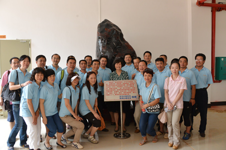 陈贵英副校长(中)与89级宝石专业的校友在赠送的鸡血石前合影