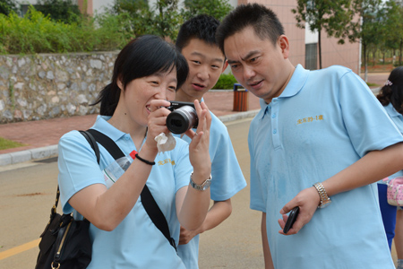 陈贵英副校长(中)与89级物探专业的校友在赠送的鸡血石前合影