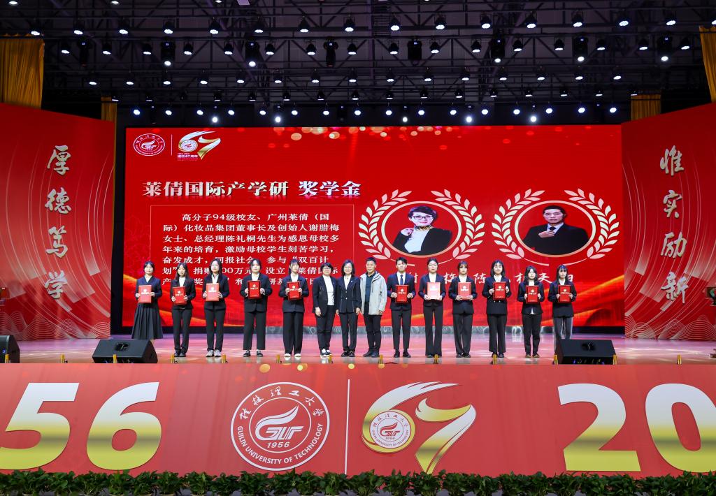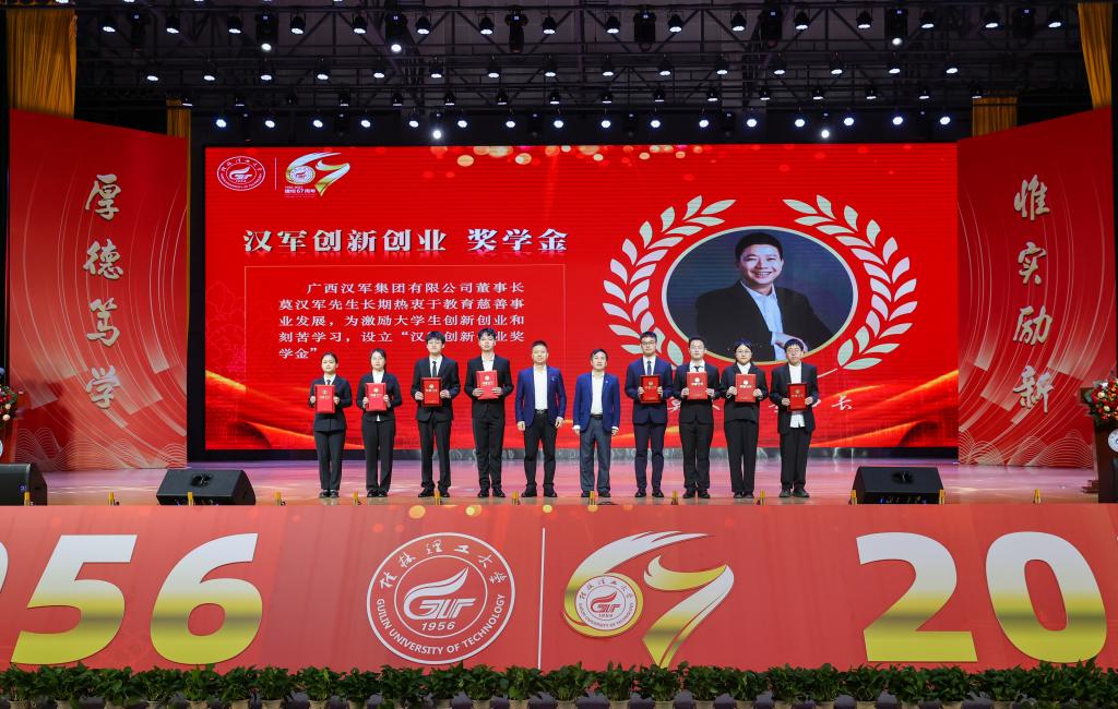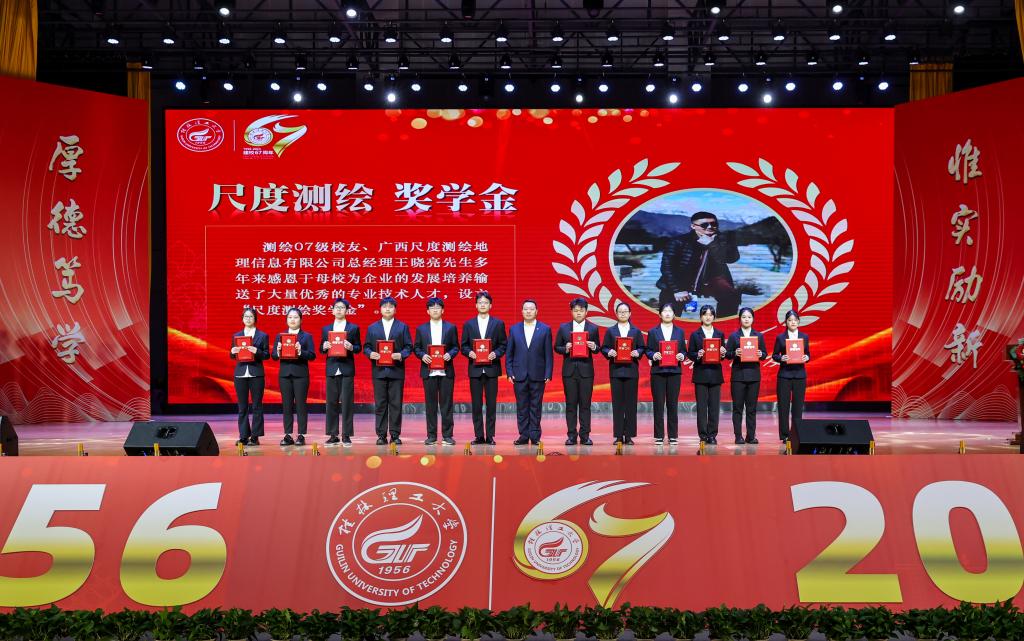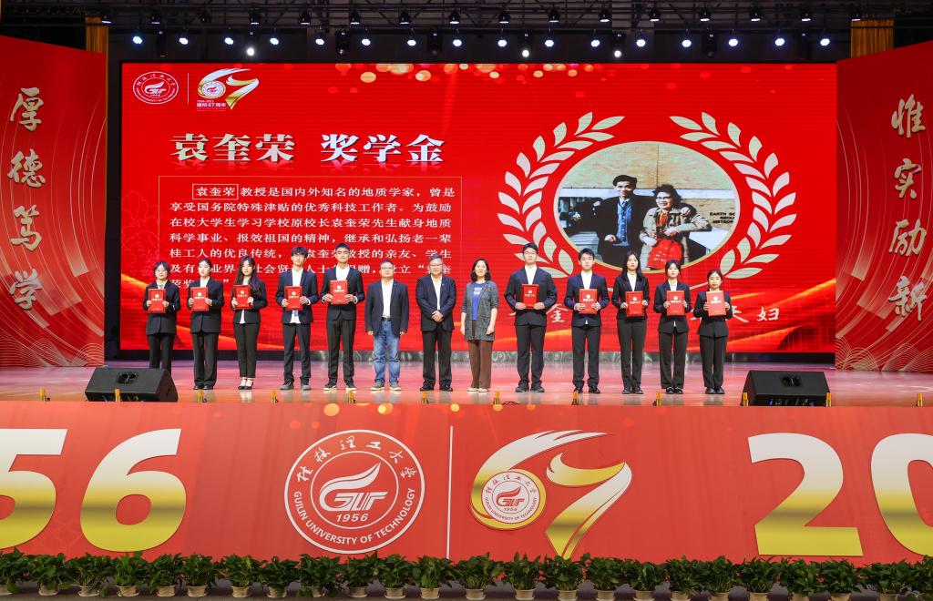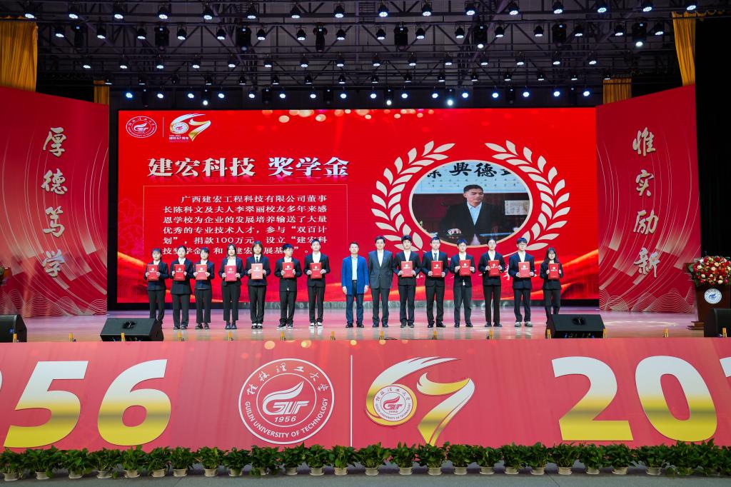 11月11日,乘着亚运会圆满闭幕的东风,在全区上下喜迎全国第一届学生(青年)运动会的喜庆氛围中,也适逢太阳成集团tyc151cc建校67周年、土木与建筑工程学院建院40周年、环境科学与工程学院建院30周年,学校在雁山校区综合体育馆举行建校六十七周年“六秩七载守初心 砥砺奋进新征程”发展大会暨“校友奖学金”颁奖典礼,总结回顾母校67年的奋进之路,展望桂工的美好未来,并对获得“校友奖学金”的师生予以表彰,弘扬广大校友们回报母校、捐资助学的善举。