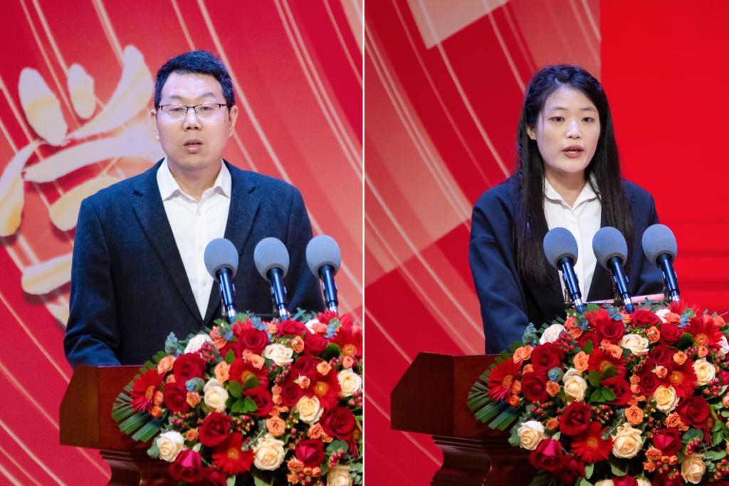 测绘地理信息学院付波霖老师、旅游与风景园林学院杜曼群同学作为获奖师生代表发言