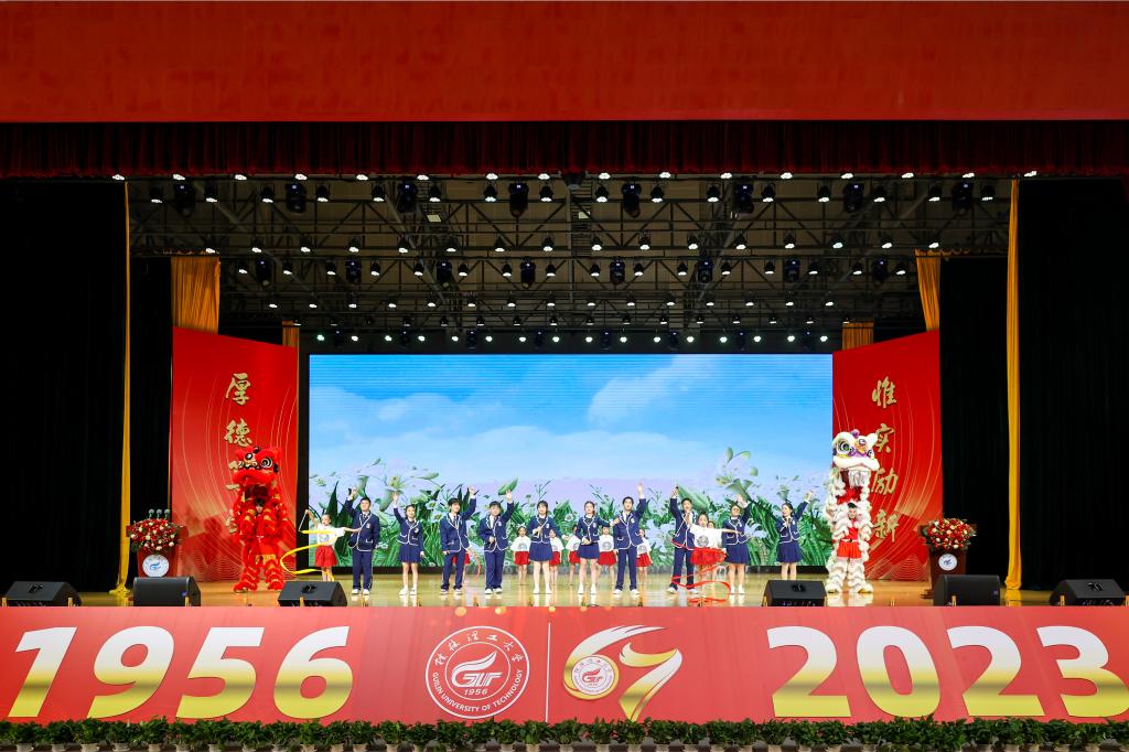 大会最后,桂林市体育局艺术体操队、国际教育学院留学生、体育教学部龙狮队和校园歌手代表用戏曲、舞狮、艺术体操、歌曲串烧等形式多样、精彩绝伦的表演为母校送上了特别的祝福,引得现场掌声阵阵。