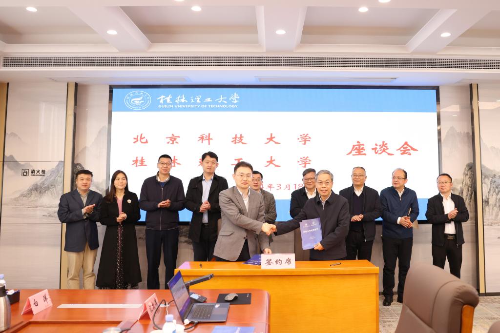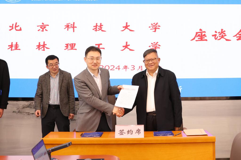 邓军代表学校向北京科技大学递交了感谢信,于成文代表北京科技大学接受感谢信。黎贞崇、于成文分别代表双方签署战略合作协议,与会领导共同见证签约。
