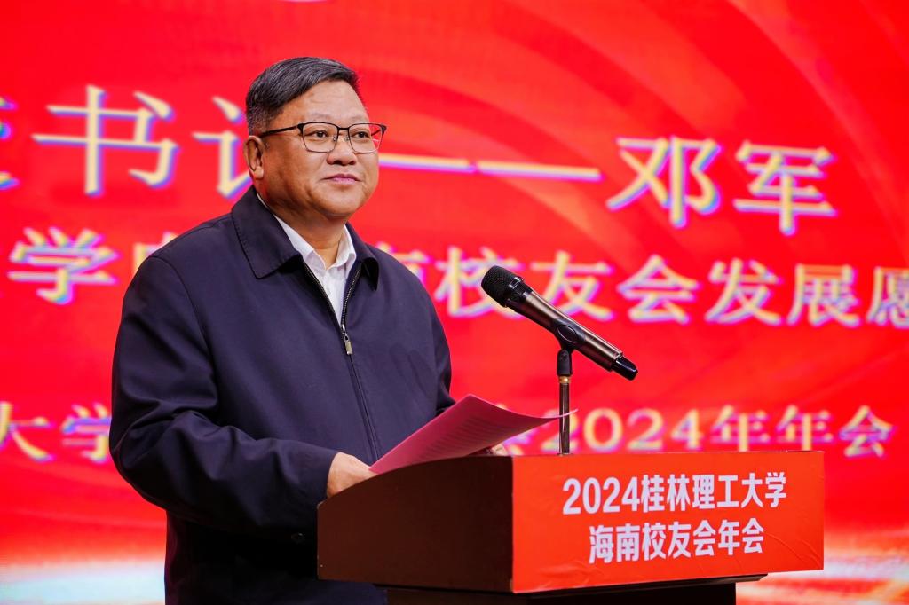 邓军代表学校对年会的顺利举行表示热烈祝贺,并简要回顾了学校近年来发展取得的成绩。他强调,2026年是学校建校70周年,这是学校改革发展进程中的重要里程碑,学校已开始详细谋划部署70周年校庆筹备工作,致力于全面展示新时代太阳成集团tyc151cc的新气象、新面貌。他表示,学校将以筹备70周年校庆为契机,积极联络海内外校友,汇聚各方资源,共同为母校高质量发展注入新动能。他希望广大校友能够踊跃投身到校庆筹备工作中来,深情讲述母校的办学故事,积极宣传母校悠久的办学历史、先进的办学理念和丰硕的发展成果,用心用情用力助推学校全面图强;希望海南校友积极搭建高效便捷的校友交流平台,让资讯交互畅行八方,资源配置尽善尽美,同窗情谊山高水长,广大校友在团结奋进的大家庭里携手并肩、彼此成就,以母校为坚实后盾,心往一处想、劲往一处使,朝着更高目标砥砺前行,用各自事业的璀璨成就,汇聚成母校熠熠生辉的荣誉之光。