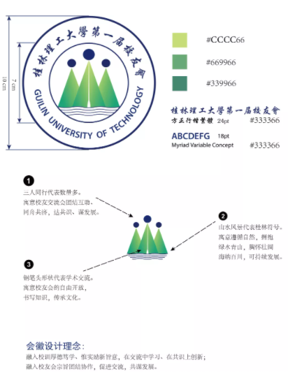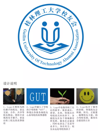 Logo主图形为两位握手的校友,表达交流、合作、共享等校友情谊,图形中表现的双手握手,更显出桂工校友的真挚情谊。