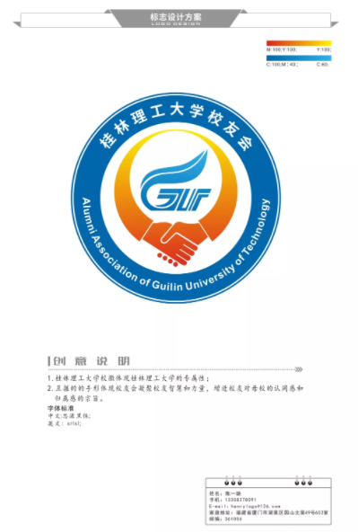 人和圆的元素的代表着校友们团结互助,携手同进,共同建设美好的未来,同时融合了五角星元素,“五角星”代表国家和五大洲的校友们,颜色运用了科技的元素代表着母校的未来已来,象征母校与校友们同在,母校的未来离不开校友们的无私奉献,寓意母校发展蒸蒸日上。(桂工校训“厚德笃学惟实励新”永象征:社会五彩斑斓远印在校友们的心中。)