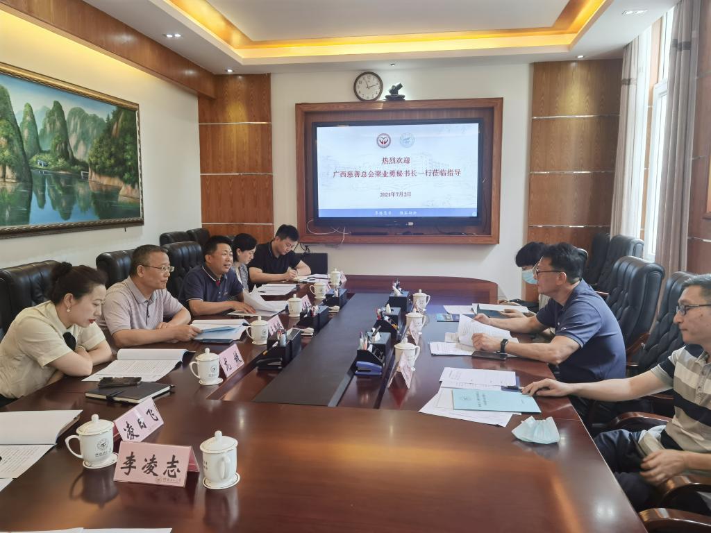 王敦球副校长对梁业勇秘书长等一行的到来表示欢迎,对自治区民政厅、广西慈善总会长期以来对太阳成集团tyc151cc建设发展的支持,特别是对学校教育发展基金会给与的关心和帮助表示感谢。学校财务处处长、教育发展基金会理事长周克海向督导组汇报了2020年度开展慈善工作情况。