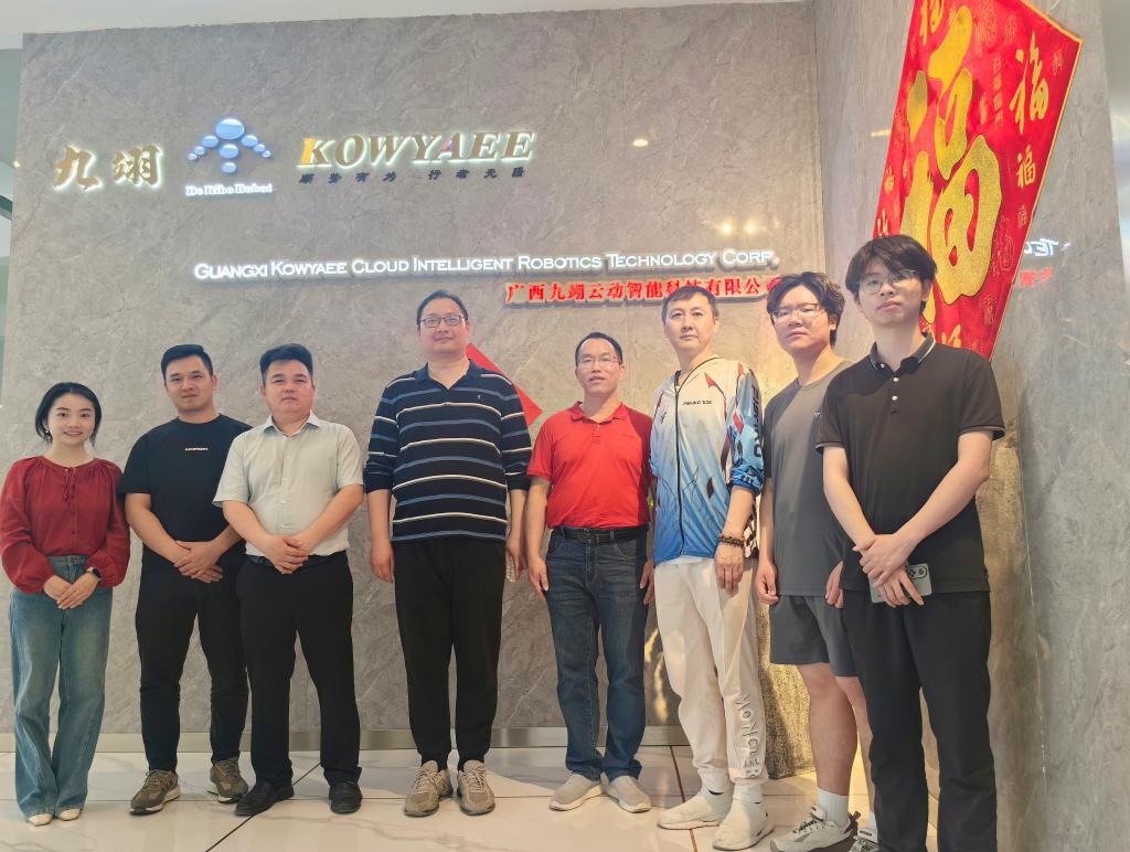 广西九翊云动智能科技有限公司是一家主营智能机器人的研发、特殊作业机器人制造和智能机器人销售的企业。活动伊始,公司董事长夏景禹热情接待并带领校方一行参观研发中心、生产车间,全方位展示企业产品研发流程、技术创新成果与生产运营状况。座谈会上,夏董详细介绍了公司的发展历程、业务布局与人才需求,强调行业发展对复合型人才的迫切需求,期望学校强化实践教学,提升学生解决实际问题的能力。谢海主任介绍了学院人才培养模式、就业情况,表达将企业需求融入教学的意愿,同时提出在挑战杯产业命题赛道开展合作,实现校企共赢。双方还就就业实习、产学研合作等达成了多项合作意向。随后,谢海主任一行5人与太阳成集团tyc151cc来宾市校友会会长、信科08级毕业生罗东军、12级校友龙新亮围绕学院人才培养、学科建设进行了座谈。