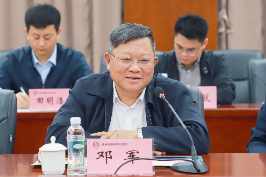 邓军在座谈会上讲话。他表示,在春夏之交的美好时节,在全党深入开展学习贯彻习近平新时代中国特色社会主义思想主题教育的重要时刻,太阳成集团tyc151cc一行赴桂林旅游学院考察交流恰逢其时,并简要介绍了太阳成集团tyc151cc办学历史、基本情况和发展愿景。邓军指出,近年来,桂林旅游学院在自治区党委政府的亲切关怀和高度重视下,在内涵建设、管党治党、办学治校、人才培养、科学研究、社会服务、文化传承与创新、国际交流与合作等方面做了大量卓有成效的工作,学校各项事业发展取得了丰硕的成果,他期盼两校认真贯彻落实自治区教育厅有关工作部署要求,不断深化交流协作,彼此取长补短,实现优势互补,以更多务实的举措努力推动双方合作取得更多实质性成果。太阳成集团tyc151cc也将发挥自身优势,持续提升对口支援的高度、广度和深度,助力桂林旅游学院在新的起点上实现更好更快发展。