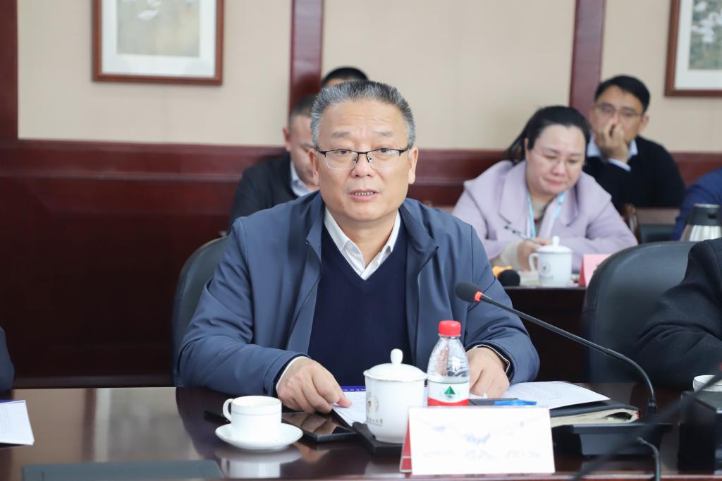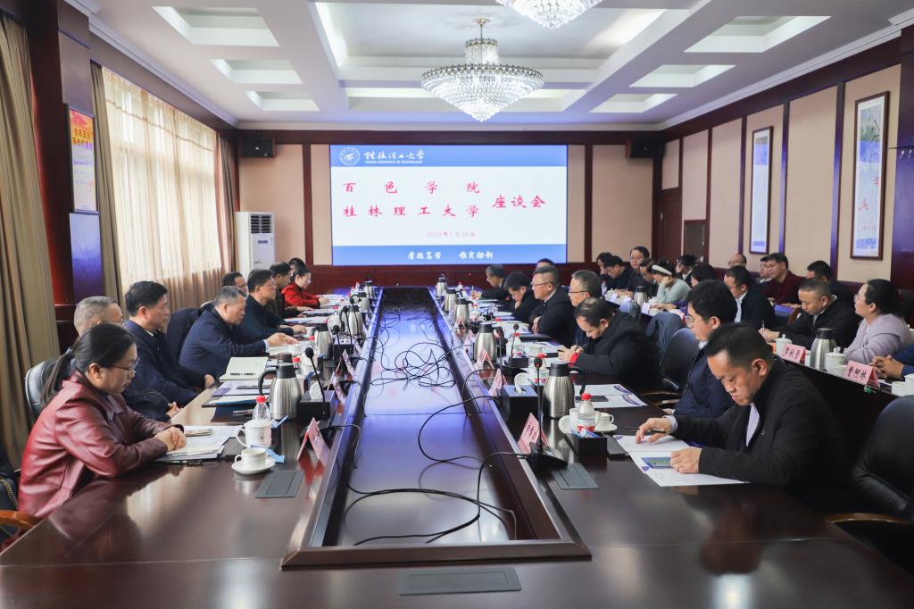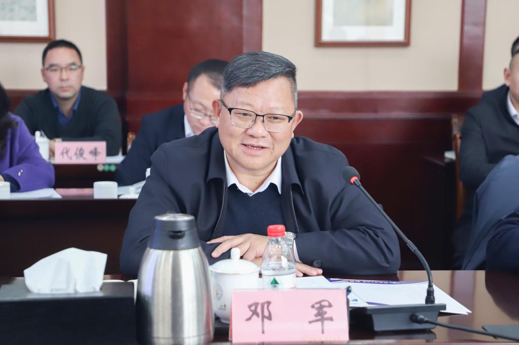 邓军在座谈会上讲话。他对百色学院唐拥军书记、吕嵩崧校长一行莅校访问表示热烈欢迎,对百色学院近年来各项事业高质量发展取得的喜人成绩表示由衷敬佩。他表示,学校党委将站在战略和全局高度认识对口支援工作的重要性,把落实好对口支援工作作为一项重要政治任务,与百色学院一起坚守为党育人、为国育才初心使命,共同为广西教育事业加快发展高质量发展、为壮美广西建设作出更大贡献。他希望双方以座谈交流为契机,双向奔赴、共同发力,重实效、强实干、抓落实、求突破,在前期合作的实践基础上,进一步深化需求对接,细化合作条款,确保对口支援工作落实落地落细,推动两校合作结出更加丰硕的成果,为实现两校既定发展目标、助力广西高等教育高质量发展增光添彩。